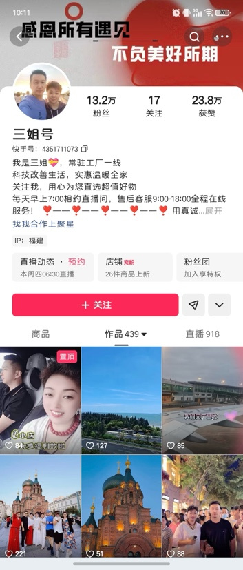 在此基础上,三姐也尝试拍摄一些日常生活视频在快手上发布,接地气的内容持续为她积累人气,带来了不少高粘性的粉丝。在她看来,自己41岁才开始接触直播电商,对很多工具的使用、经营技巧都是“小白”状态,能将只有几个人的直播间一点点做到如今的体量,“要感谢自己不愿放弃的韧劲”。