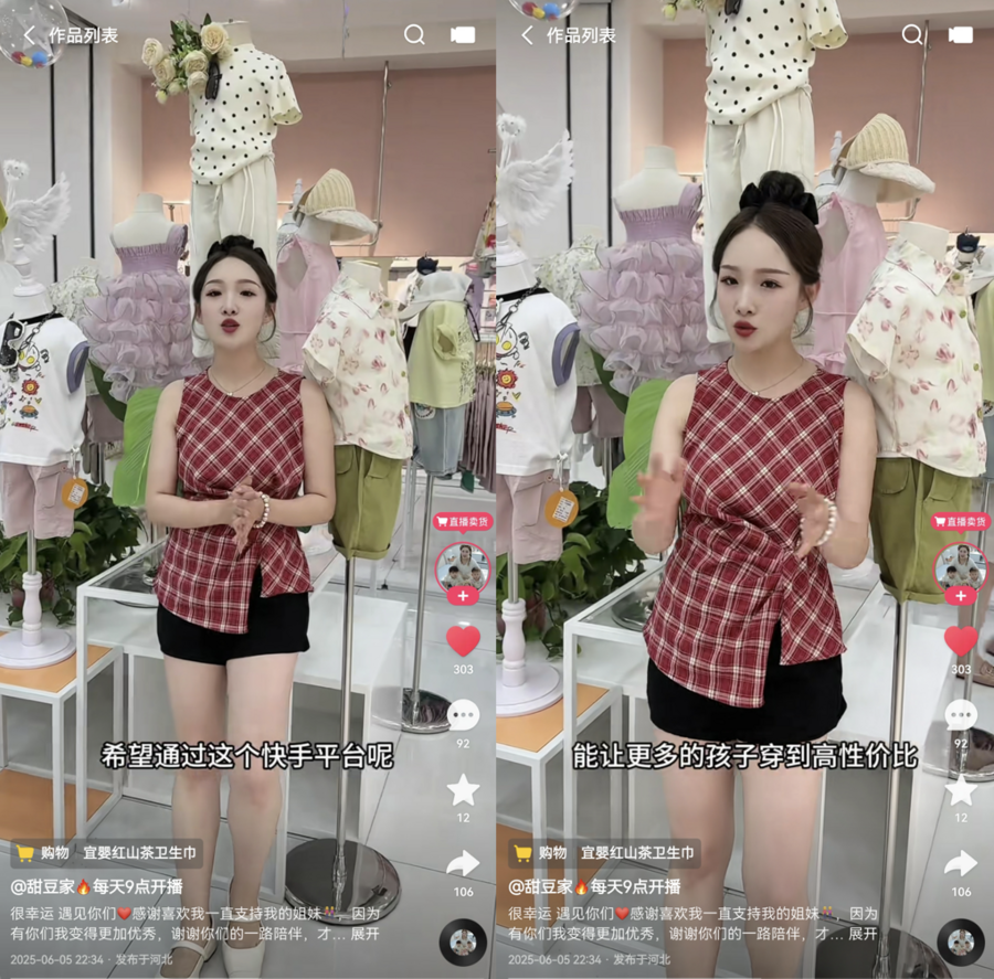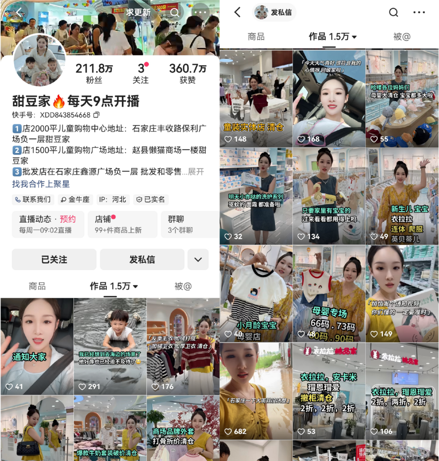 快手“甜豆家”的老板娘甜豆深谙此道。从十年前做童装批发,到五年前在快手开播,再到如今拥有两家上千平的购物广场,凭借对品质的极致追求和对粉丝承诺的坚守,她在竞争激烈的婴童行业扎下了根,赢得了一批又一批忠实“宝妈粉”的信任票。