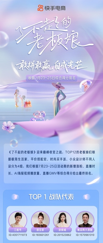 为打造更多更有影响力的老板娘,今年618期间,快手电商女装亲子行业推出了“了不起的老板娘”活动,将持续带来各类活动玩法和扶持资源。目前,活动迎来收官之战,来自时尚买手派、平价搭配官、极简生活家、小众设计师四大赛道的12名老板娘,经过3天决赛,依据涨粉量、AI海报视频播放量、直播GMV等综合成绩评定,最终由@三姐号、@甜豆家、@欲倾城、@唯品购大漂靓 组成的战队摘得桂冠。