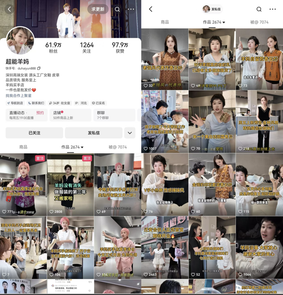 在做快手女装生意三年,@超能羊妈 从0粉到拥有超60万粉丝,从个位数销量到单品销量上万,从一间小工作室,到如今把门店开到了唐山的五区十县,拥有多家几百平的羊妈买手店,年销售规模甚至过亿。在羊妈看来,她的经历不算精彩,也难说幸运,三年来向前迈的每一步,背后都是对产品的极致打磨以及对每位粉丝的真诚相待。
