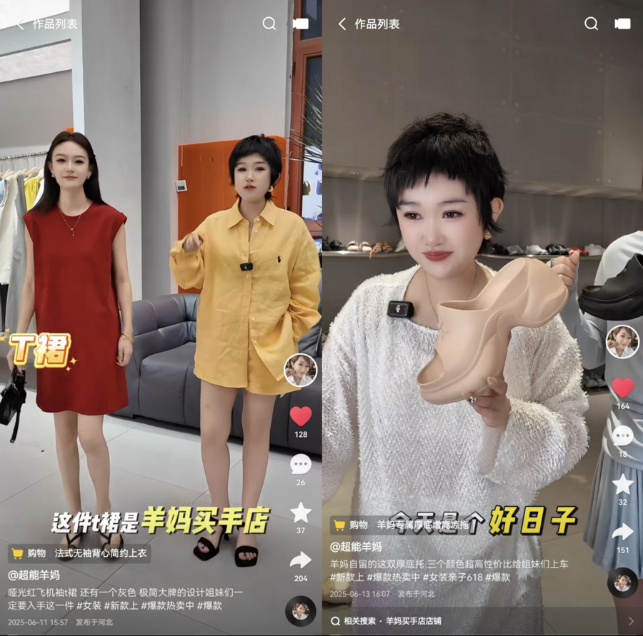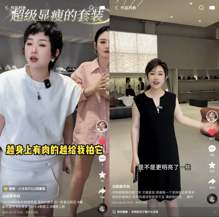 打好了“货”的基础,羊妈又开始通过短视频、直播内容,塑造起“人”的招牌。“说实话,我作为一名女装主播,没有漂亮脸蛋,也没有高挑的身材,但我能找到最适合粉丝的衣服,不断打磨爆款,把性价比拉到极致。”在短视频中,羊妈也会增加生活内容,“让大家看到一个真实、接地气的服装老板娘”。