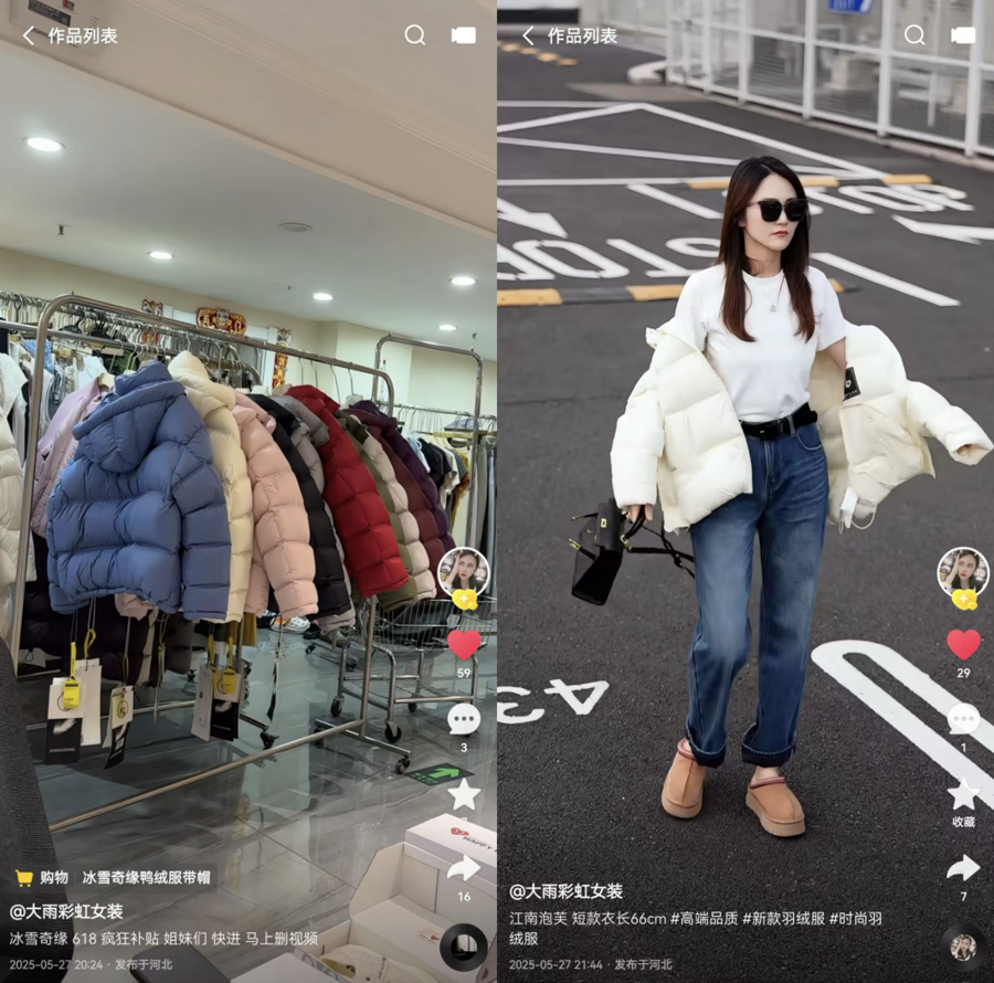 大雨的工作室中,不同人分工明确,各自带着新的目标:设计团队紧锣密鼓地研发秋冬季新品;大雨筹备着去上海等城市参加时装周;大雨的丈夫则带领团队深入江苏面料基地拍摄溯源视频,记录羽绒服从原料到成衣的完整生产过程。“我们要做一系列的高质量短视频,让粉丝亲眼看见每款衣服的诞生,知道每一朵羽绒的来源。”