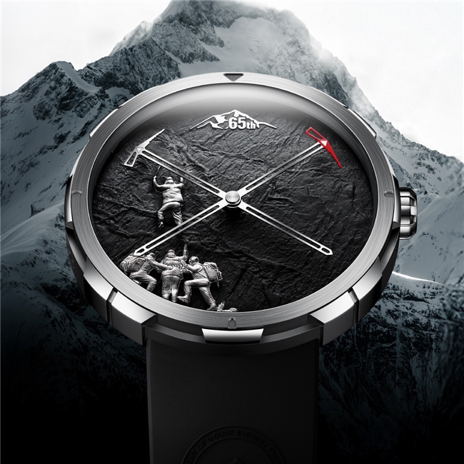 表盘融入珠峰浮雕与「65th」纪念标识,铭记中国攀登者登顶珠峰65周年里程碑时刻。浮雕以精密立体雕刻还原珠峰山体轮廓,层次分明;搭配瑞士Super-LumiNova C1夜光涂层,昼夜皆赏珠峰盛景。冰镐造型指针致敬攀登精神,经精密切割与手工打磨,完美还原工具经典形态;夜光指针与刻度精准呼应,无论何种环境皆可清晰读时,如攀登者手中冰镐,始终指引前行方向。